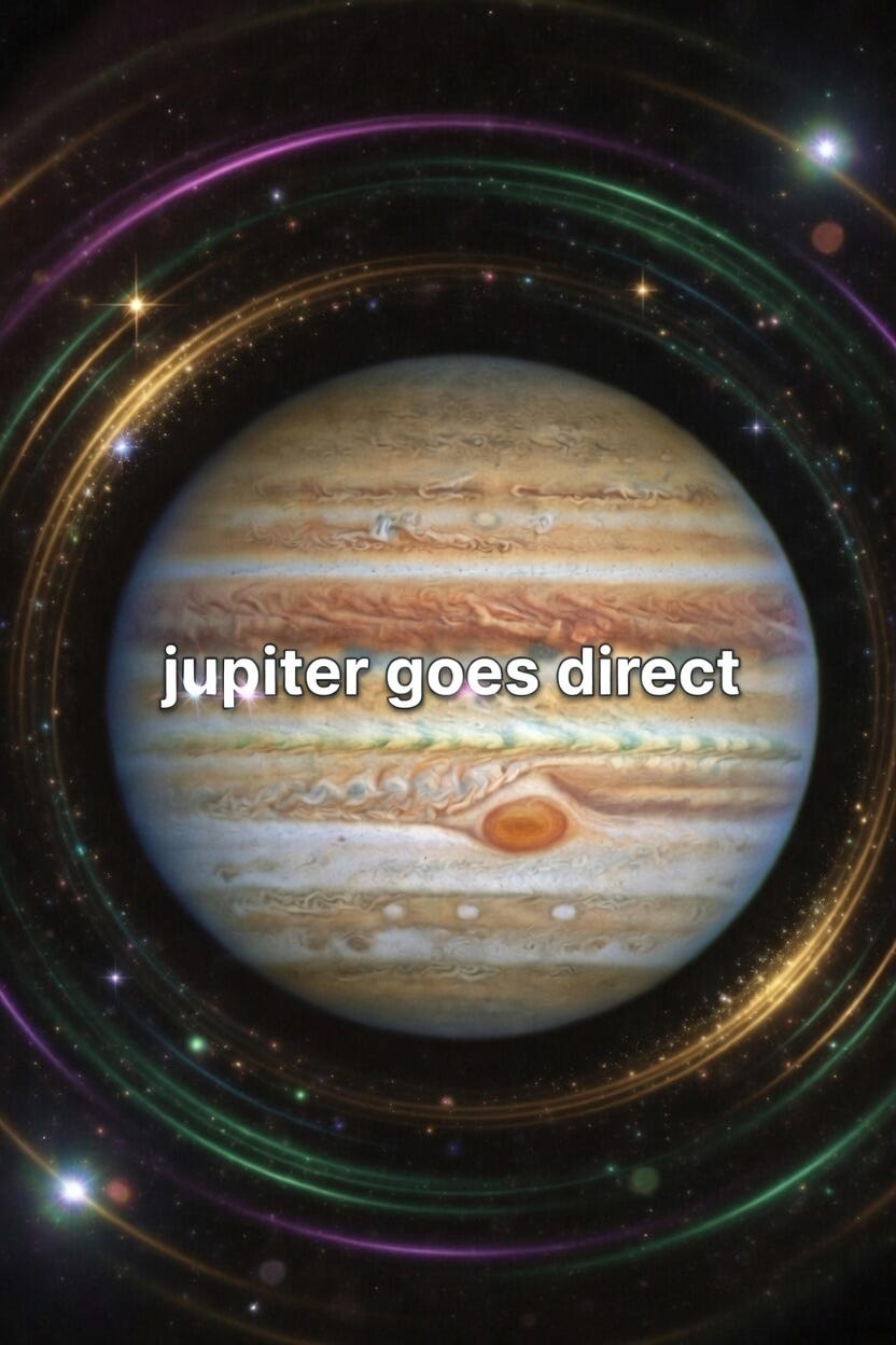 Jupiter going direct, particularly in its exalted position in Cancer, after months of retrograde introspection since November 2025, marks a powerful cosmic shift toward outward expansion, renewed optimism, and the flow of abundance that had been turned inward for reflection.